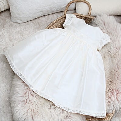 Such a special little silk Christening dress for your baby's special day. The Clara baptism dress is made from 100% silk dupion, the bodice features a delicate Cluny lace and little appliqué detailing. The sweet little cap sleeves are finished with the same Cluny lace and the hem features a deeper lace. The dress is finished with silk covered handmade buttons and rouleaux loop fastenings. Handmade to order. Ivory. 100% silk. Fully lined. Made in Scotland.